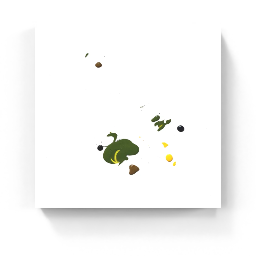 A loose cluster of olive green, black, ochre, and yellow pigment sits like a microcosmic burst—balanced between chaos and order. This minimalist abstract painting feels both cellular and cosmological.