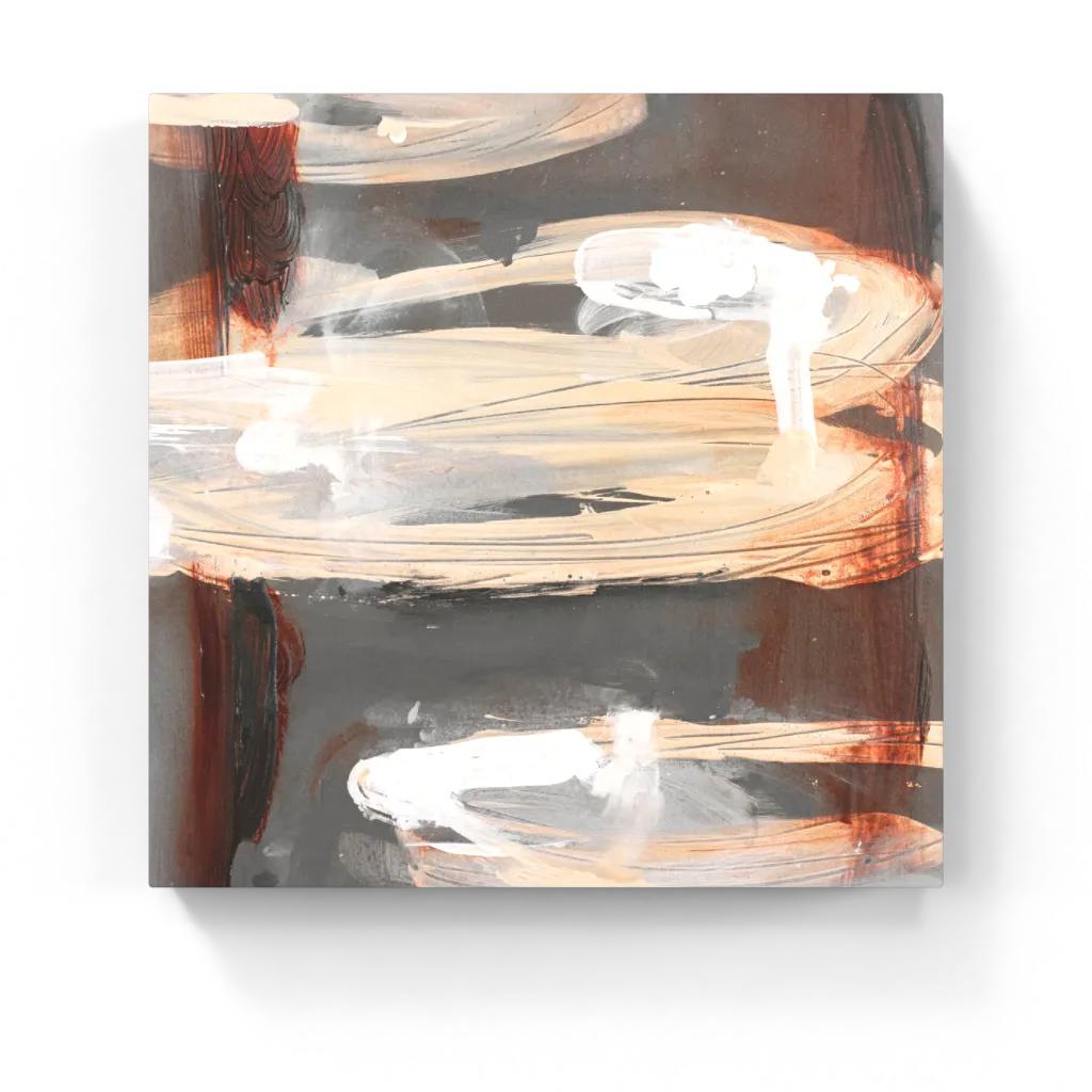 Soft loops of ivory and beige drift across a surface of smoky gray and rust, forming layered rhythms that evoke motion, erosion, and light. This abstract painting merges industrial grit with ethereal gesture.