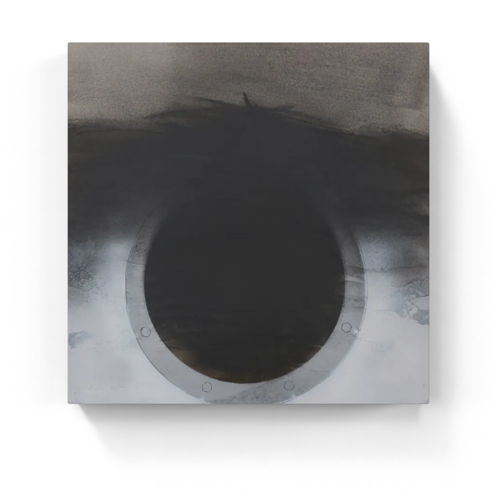 A shadowy void framed by bolts and steel-like texture looms in soft grayscale—part porthole, part portal. It’s industrial abstraction with a moody edge, suspended between function and enigma.