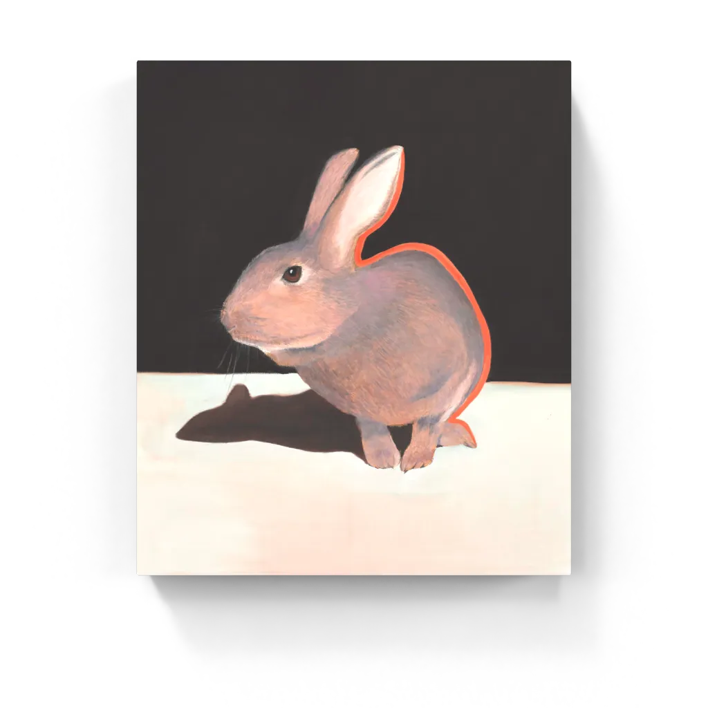 Bathed in soft rose hues and haloed with a bold orange outline, this rabbit perches on pale ground before a deep black void. Its shadow stretches like a quiet whisper, blending realism with pop surrealism in a perfectly still moment.