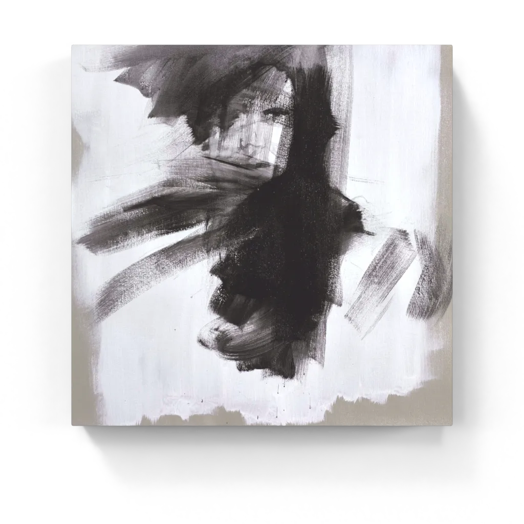 A face emerges from broad, violent strokes of black and ash-gray, as if memory is clawing its way through smoke. This abstract portrait is both haunted and haunting—raw presence in shadow and suggestion.