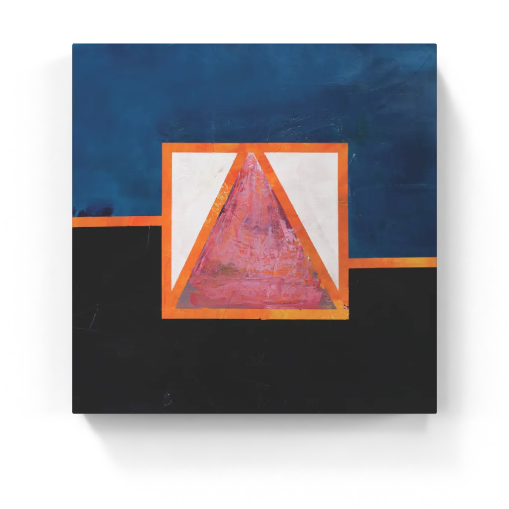 A vibrant red triangle anchors the center of a geometric portal—boxed in by sharp white angles and outlined in bold orange. Set against moody blues and deep black, this symbol pulses like a warning or a beacon in a coded universe.
