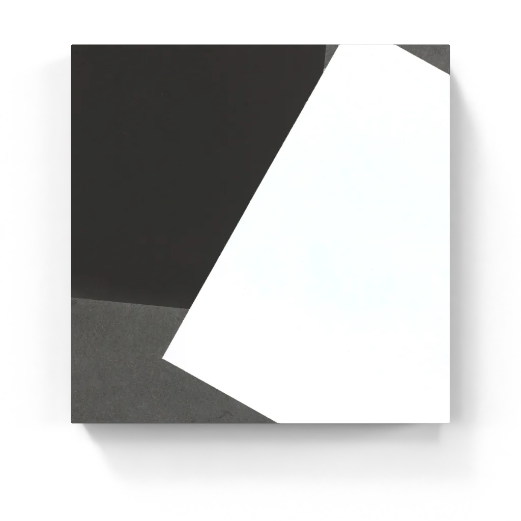 A bold white plane slices diagonally into deep black and muted gray, forming a stark visual equation of space and silence. Pure geometry, high contrast, and minimalist rigor converge in this crisp abstraction.
