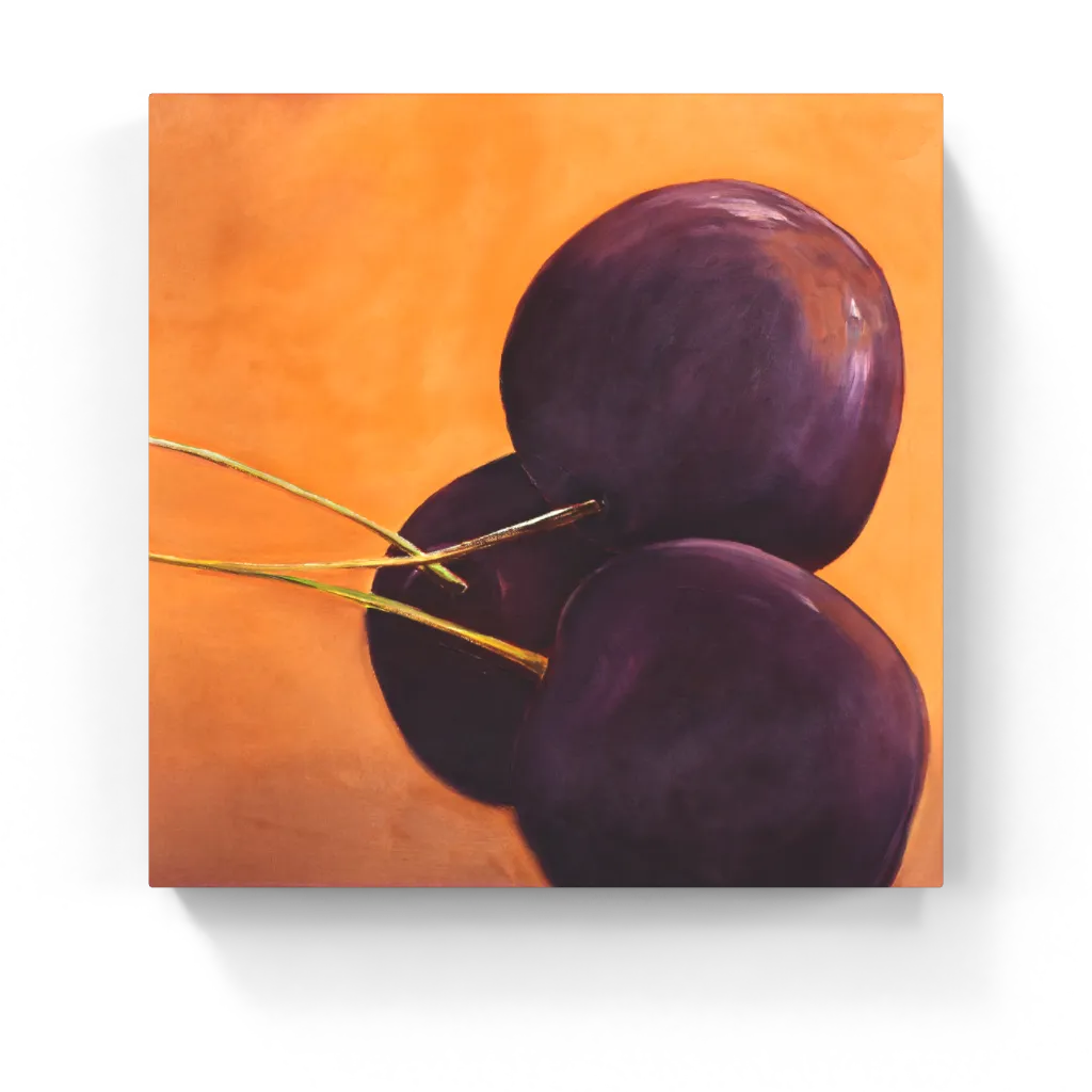 Three deep purple cherries rest against a glowing amber backdrop—smooth, ripe, and almost surreal in their bold simplicity. The contrast between rich shadow and radiant warmth turns this still life into something quietly cinematic.