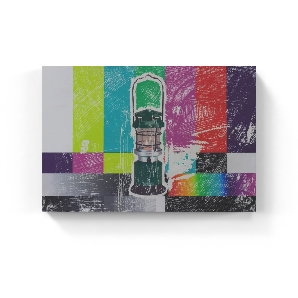 A lone green lantern glows at the center of a glitching TV test screen—part survival gear, part beacon in digital collapse. Surreal and saturated, this piece fuses analog nostalgia with post-broadcast dissonance.