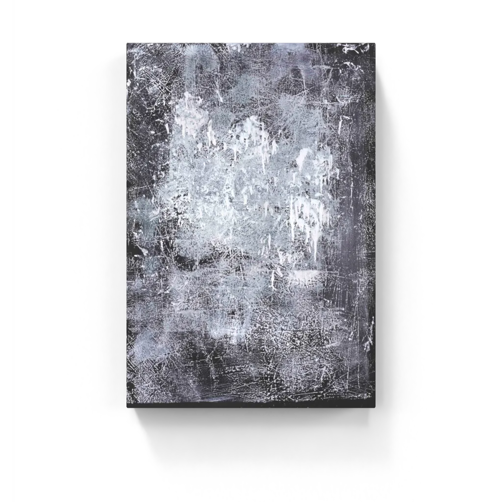A blizzard of etched lines and icy drips coats a blackened surface, as if frost has frozen mid-motion. Chaotic yet crystalline—this is erosion rendered elegant.