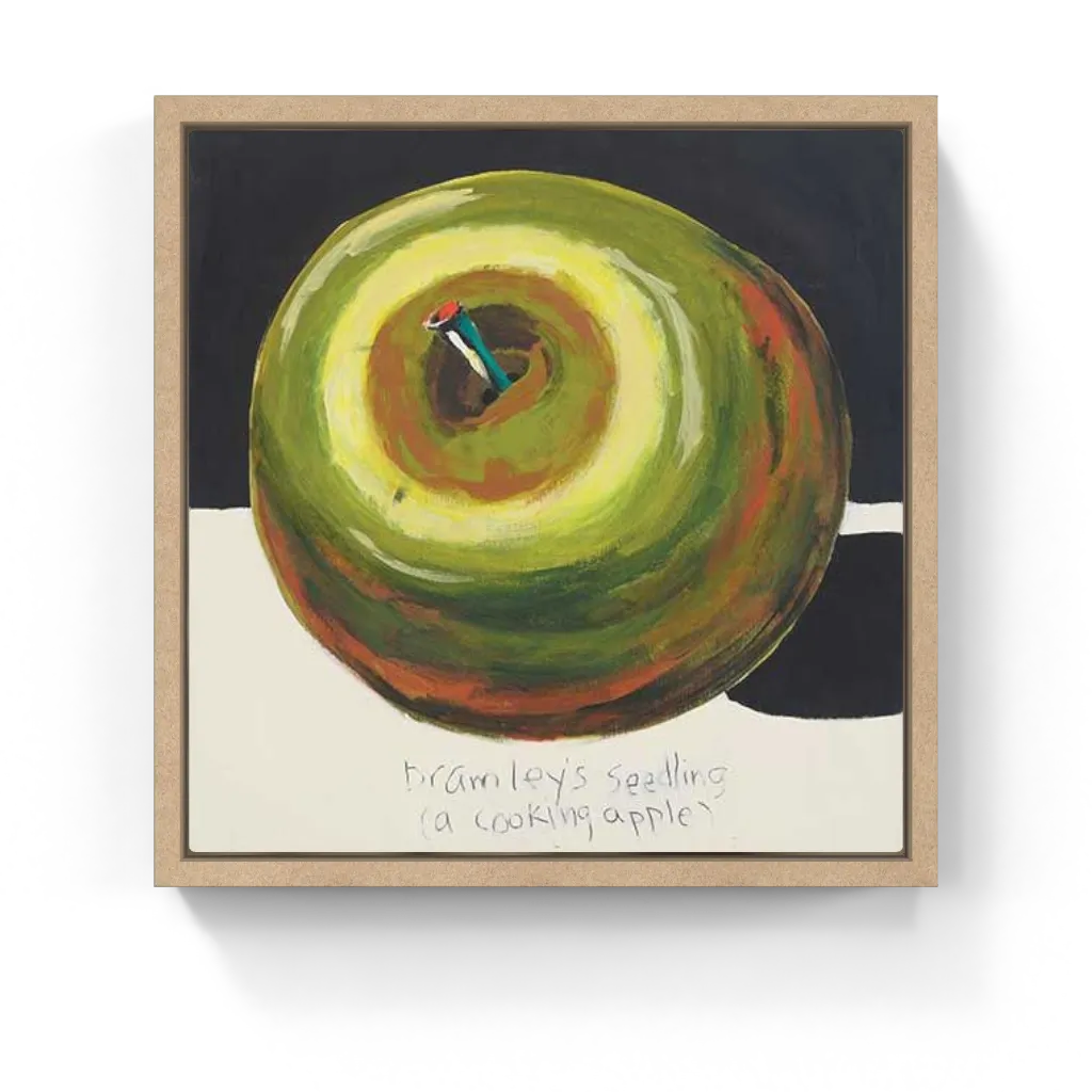 This pop art apple portrait playfully celebrates the humble Bramley. Painted in bold, punchy greens with moody shadows and handwritten charm, the composition feels both cheeky and painterly. A fresh take on pop-art style, this portrait brings humor, color, and graphic edge to contemporary interiors.