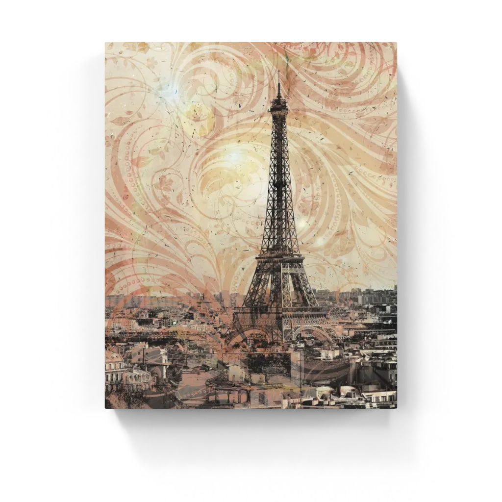Romantic mixed-media portrayal of the Eiffel Tower set against a sophisticated backdrop of elegant swirling floral patterns in muted sepia tones, evoking vintage Parisian charm and timeless elegance.