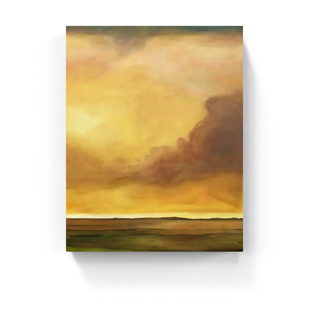 This atmospheric landscape painting glows with a golden sky that blends into warm amber clouds and an earthy horizon. The layered tones create a serene and inviting mood. Perfect for sophisticated interiors that value warmth, elegance, and timeless style.
