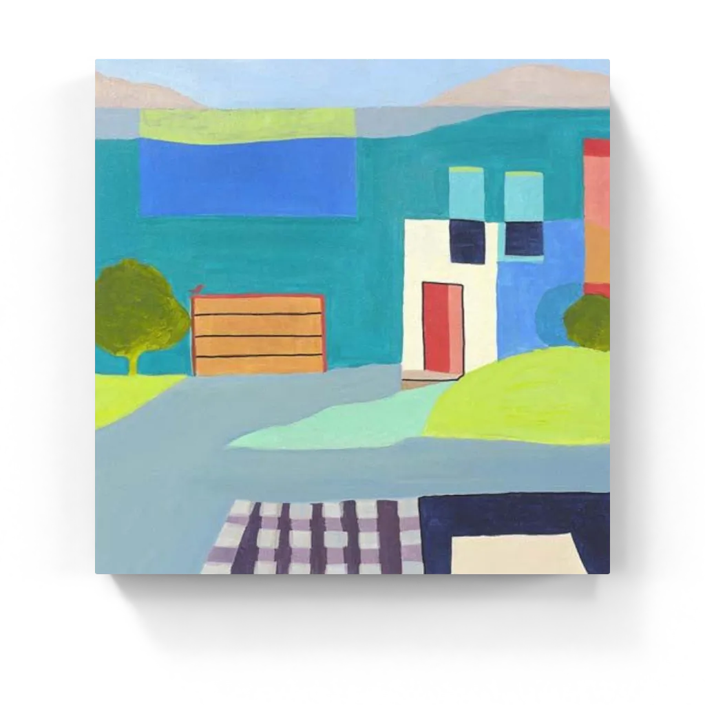 This geometric abstract painting playfully reimagines a suburban scene. Bold colors and blocky shapes simplify homes, trees, and driveways into a joyful patchwork of modern life. A vibrant and contemporary piece that brings charm and energy to any space.