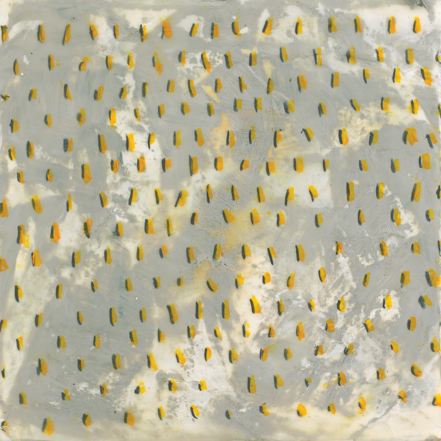 Rows of golden strokes rise from a hazy gray field, evoking scattered grain or abstracted growth—this minimalist composition blends repetition with texture, capturing a quiet rhythm of nature and mark-making.