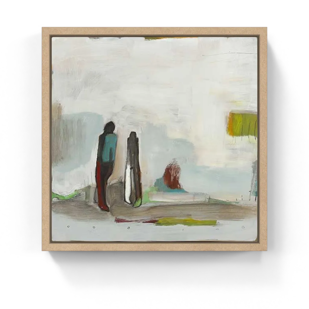 Figurative forms appear within a quiet expanse—this abstract urban painting hints at human presence in a softened cityscape. Muted tones mingle with unexpected pops of color, creating a dreamlike rhythm between architecture and emotion.