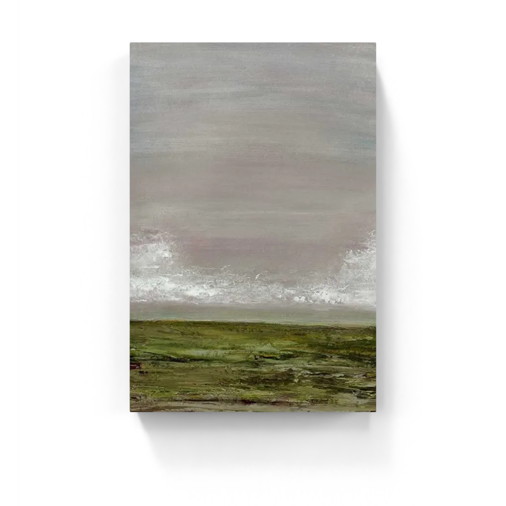 Subtle and expansive, this atmospheric landscape unfolds in muted greens beneath sweeping cloud formations and a softened horizon line. The composition captures the timeless stillness of open land and sky—offering a meditative glimpse into nature’s quiet transformations. A refined piece that invites calm, presence, and reflection.