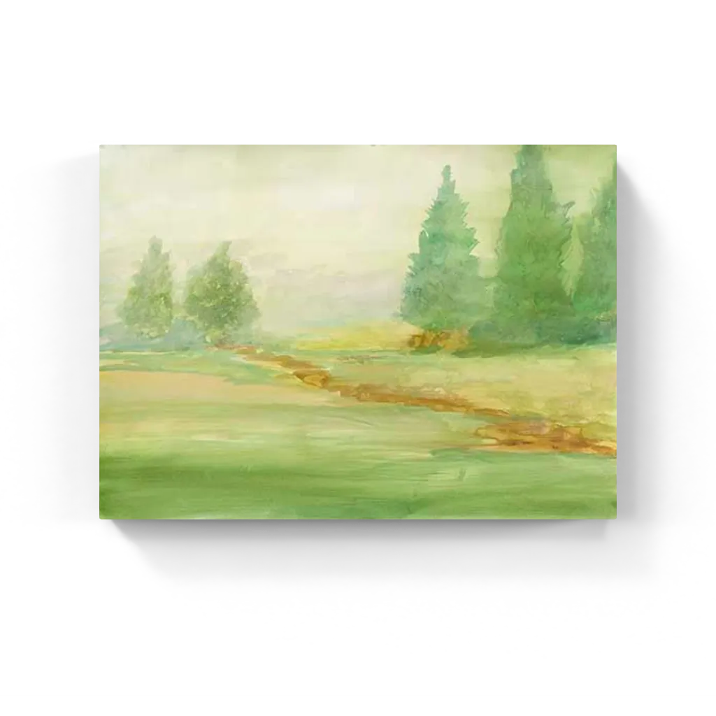 Soft and tranquil, Atmospheric Configuration V reveals a misty landscape painted in gentle washes of green, gold, and earthy brown. Tall pines and a winding path rise from the haze, giving this atmospheric landscape painting a feeling of calm and introspection.