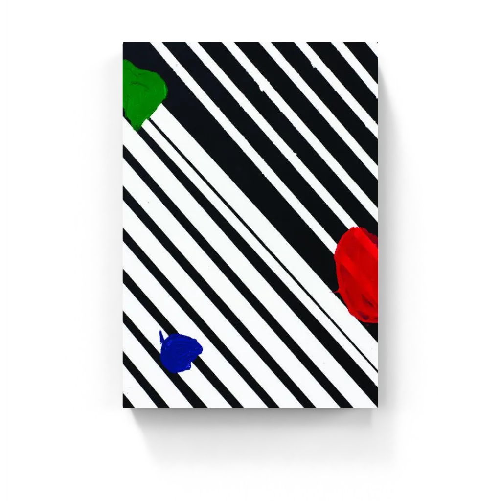 This bold abstract striped wall art features black and white diagonal stripes interrupted by vivid pops of red, yellow, and blue. The piece plays with rhythm, tension, and contrast, combining graphic structure with playful color. Perfect for contemporary interiors that embrace bold, expressive design.