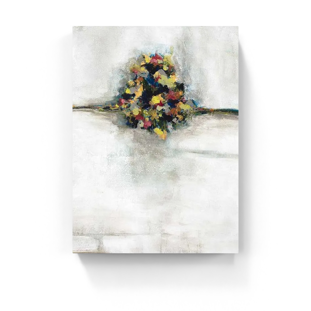 This artwork expresses colorful abstract art through a concentrated horizontal bloom of pigment breaking into open white space. The contrast between minimal structure and lush color creates a dynamic sense of movement, vitality, and expressive energy.
