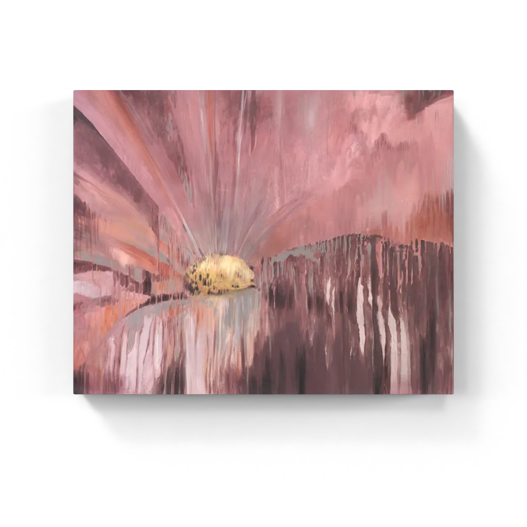 A golden bloom radiates through layers of mauve and dusty rose, its light dissolving in soft vertical drips and echoes. This ethereal abstract art captures a quiet, dreamy like moment—warm, glowing, and suspended in time.