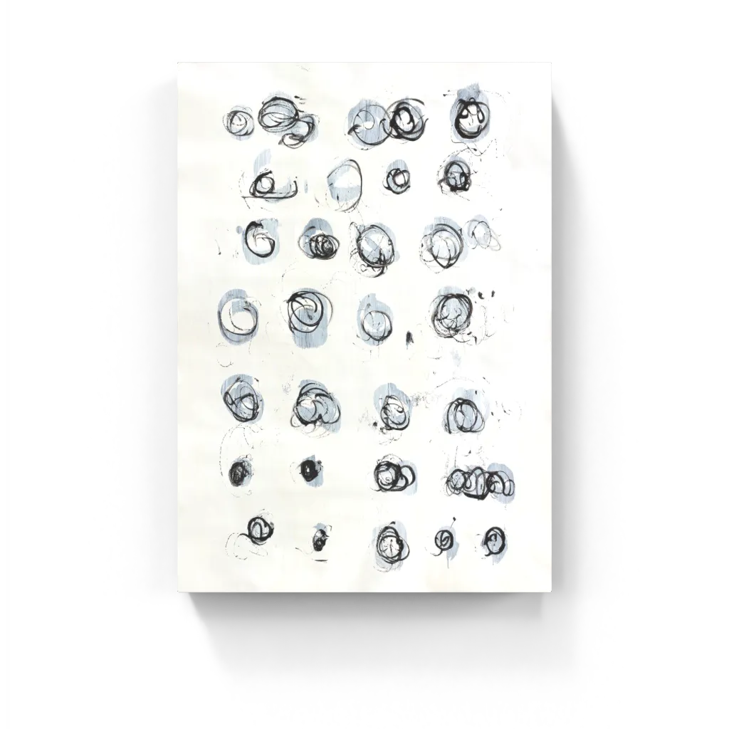 Loose black spirals dance over soft blue-gray patches in a scattered grid—each loop uniquely frantic, like echoes of thought or signals in static. This expressive abstract art captures chaos and rhythm in harmony, balancing spontaneity with refined composition.