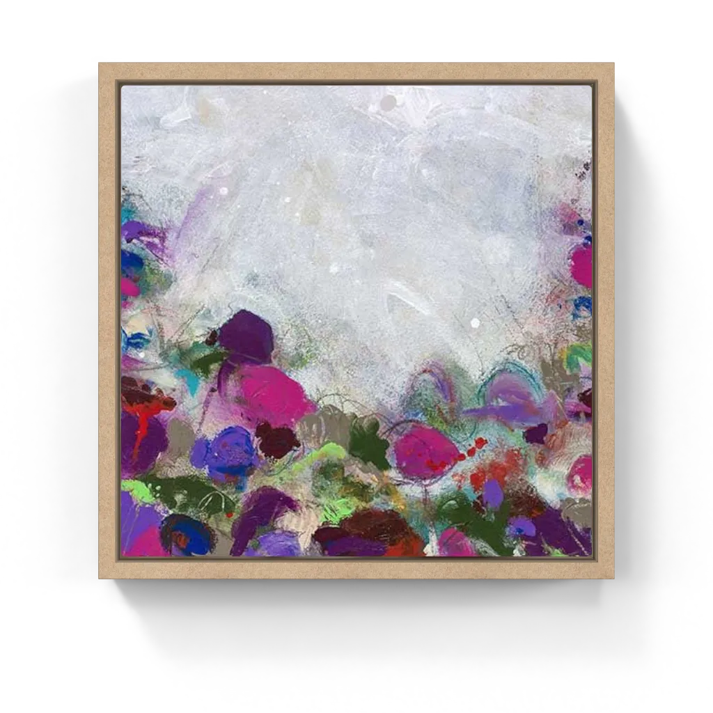This expressive abstract painting blooms with energy, as purples, pinks, and wild greens burst from the edges into a soft, misty backdrop. The composition feels lush, playful, and alive—balancing vibrancy with atmospheric depth. Full of life and movement, it’s a bold choice for contemporary interiors that celebrate color and creativity.