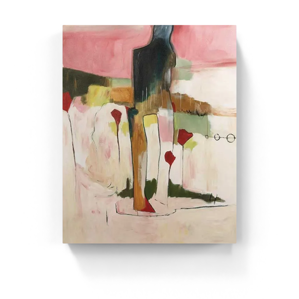 A vibrant figure rises in a surreal garden—this expressive abstract painting blends deep reds, mossy greens, and soft blush with bold linework. Poetic, playful, and full of presence, it radiates emotion and imagination through movement and color.