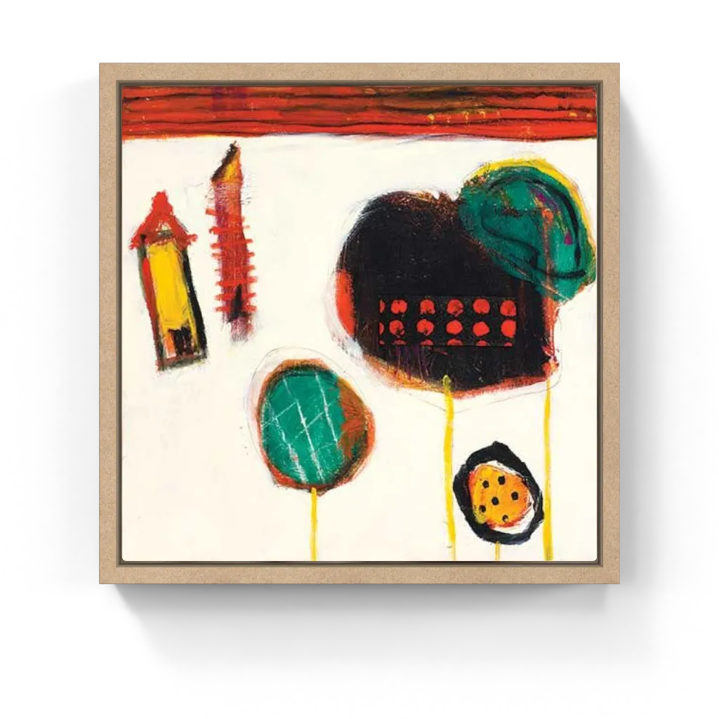 Bold color blocks and playful lines bring a dreamlike village to life—two houses and four stylized trees float in a field of white, buzzing with childlike energy and abstract charm.