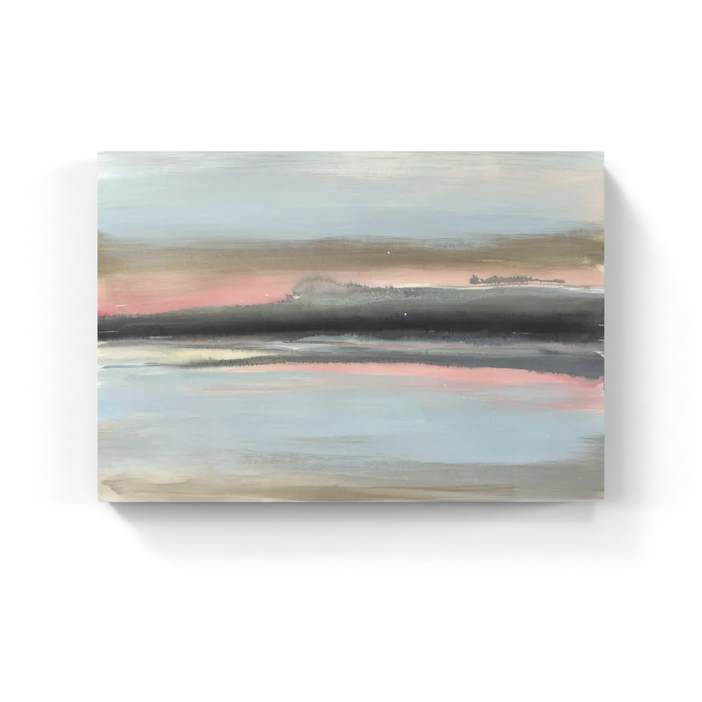 A tranquil abstract landscape with soft fuchsia highlights glowing behind a misty horizon. Muted blues, greys, and earth tones blend in smooth horizontal bands, evoking dusk over water.