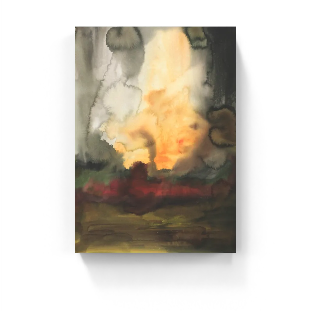A molten burst of amber light scorches through moody greens and bruised reds, smudged like memory in this haunting abstract landscape. Watercolor bleeds mimic wildfire and smoke, dissolving form into emotion.