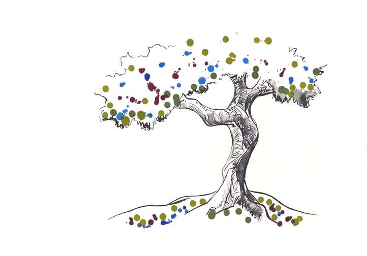 A twisting ink-drawn tree bursts to life with playful dots of color—olive, cobalt, and wine—scattered like spring blossoms. Minimal yet spirited, it's nature reimagined with a pop-art twist.