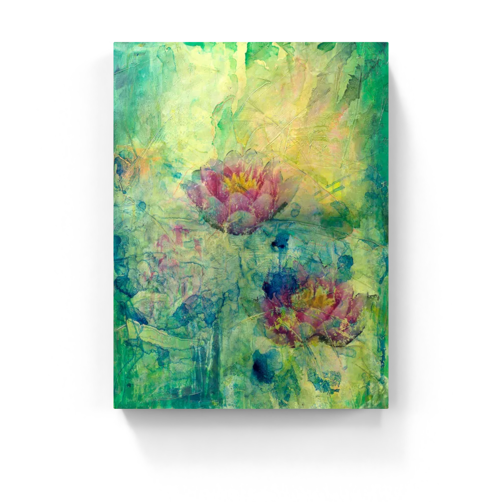 A tranquil painting featuring soft impressions of blooming lotus flowers emerging gently through layers of dreamy greens, blues, and yellows, evoking a sense of peacefulness and harmony.