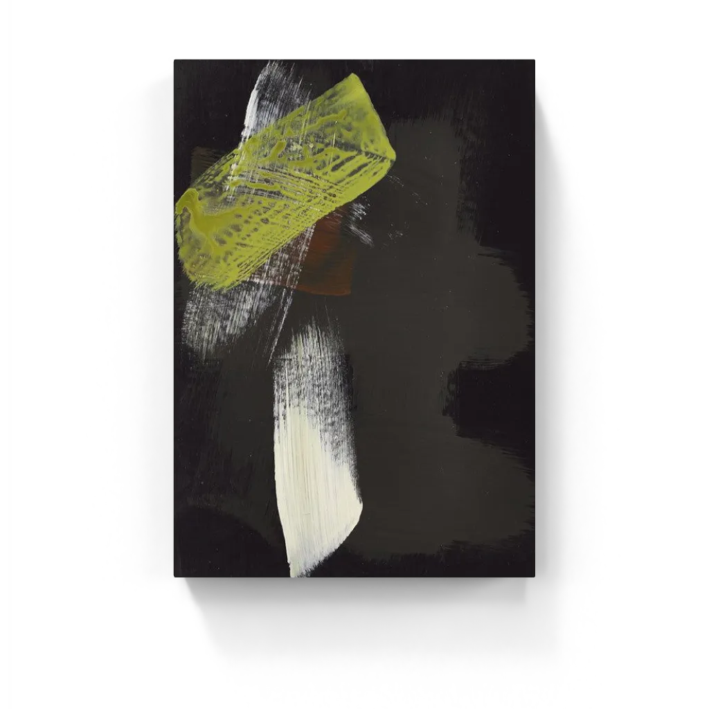 Bold streaks of vibrant olive-green and stark white disrupt deep black in this abstract, expressive artwork. Texture and dramatic contrasts evoke raw energy and contemporary rebellion.