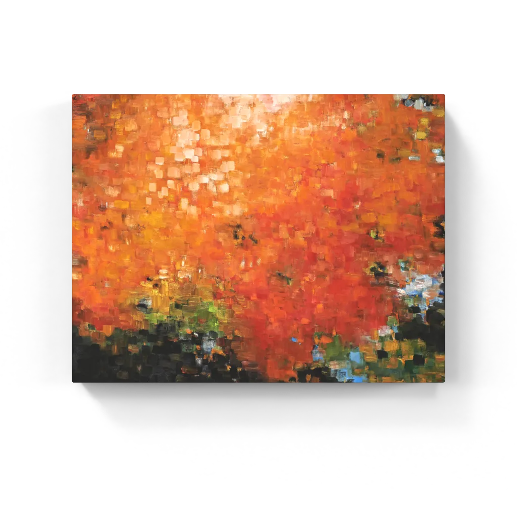 Radiant oranges, fiery reds, and golden yellows flicker across the canvas in a mosaic of warm light, evoking autumn leaves caught in sunlit motion. This impressionistic abstraction pulses with color, rhythm, and glow.