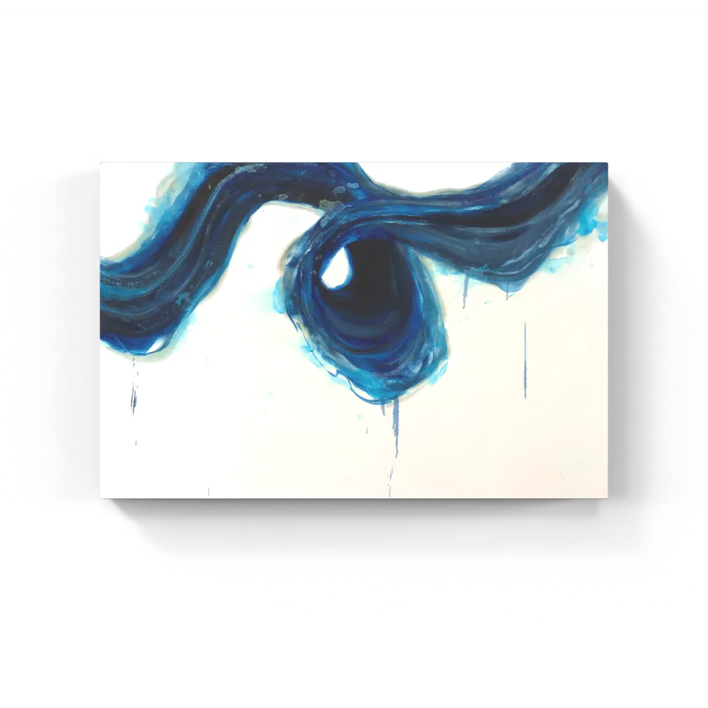 A dark indigo ribbon undulates across a pale canvas, coiling into a deep vortex that suggests both calm and collapse. This indigo abstract painting channels the slow pull of a current—fluid, ominous, and endlessly in motion. Contemporary and atmospheric, it captures rhythm, tension, and the force of unseen depths.