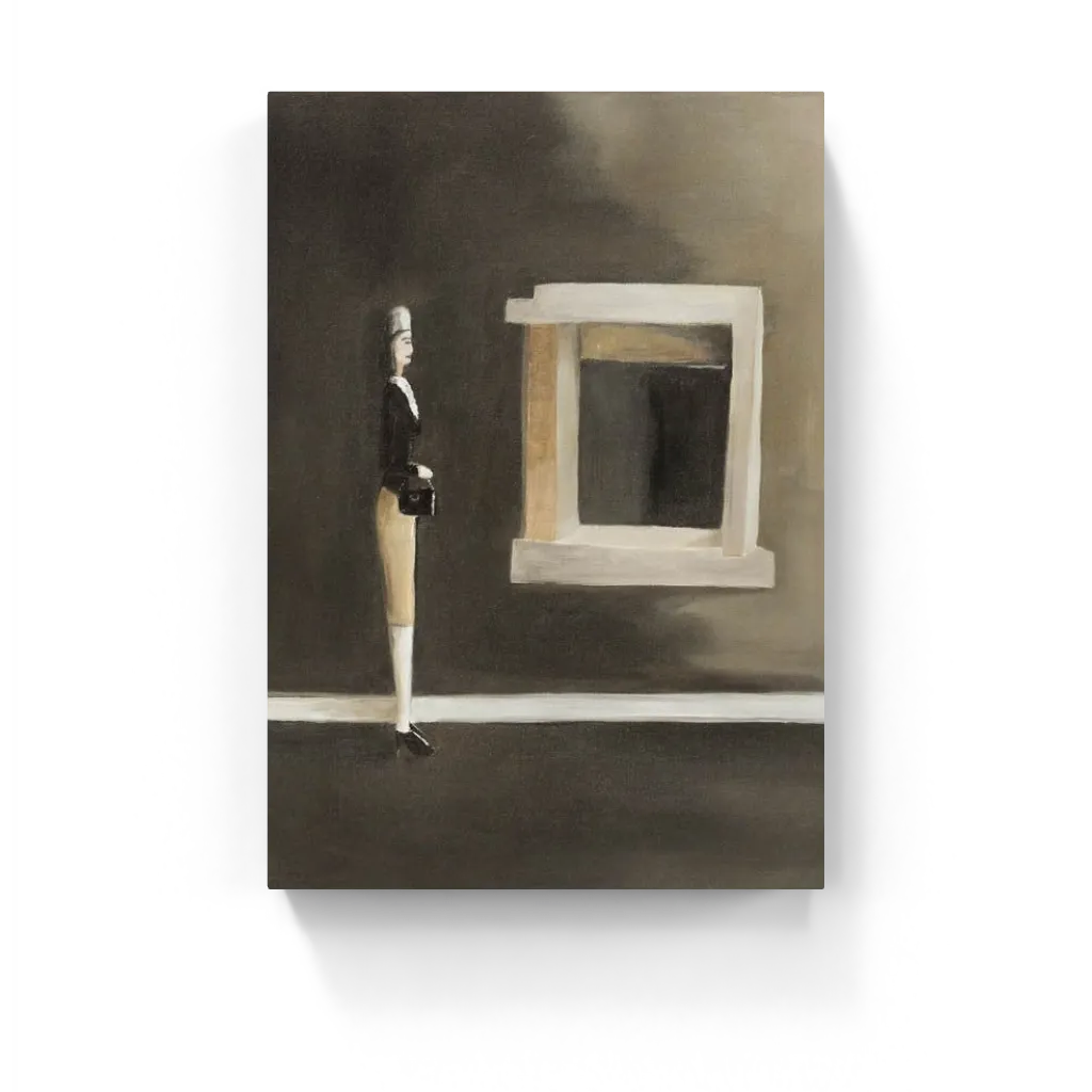 Muted tones meet surreal minimalism in this enigmatic portrait of a poised woman facing a stark, blocky window. Warm beige and shadowy grays echo a dreamlike silence.