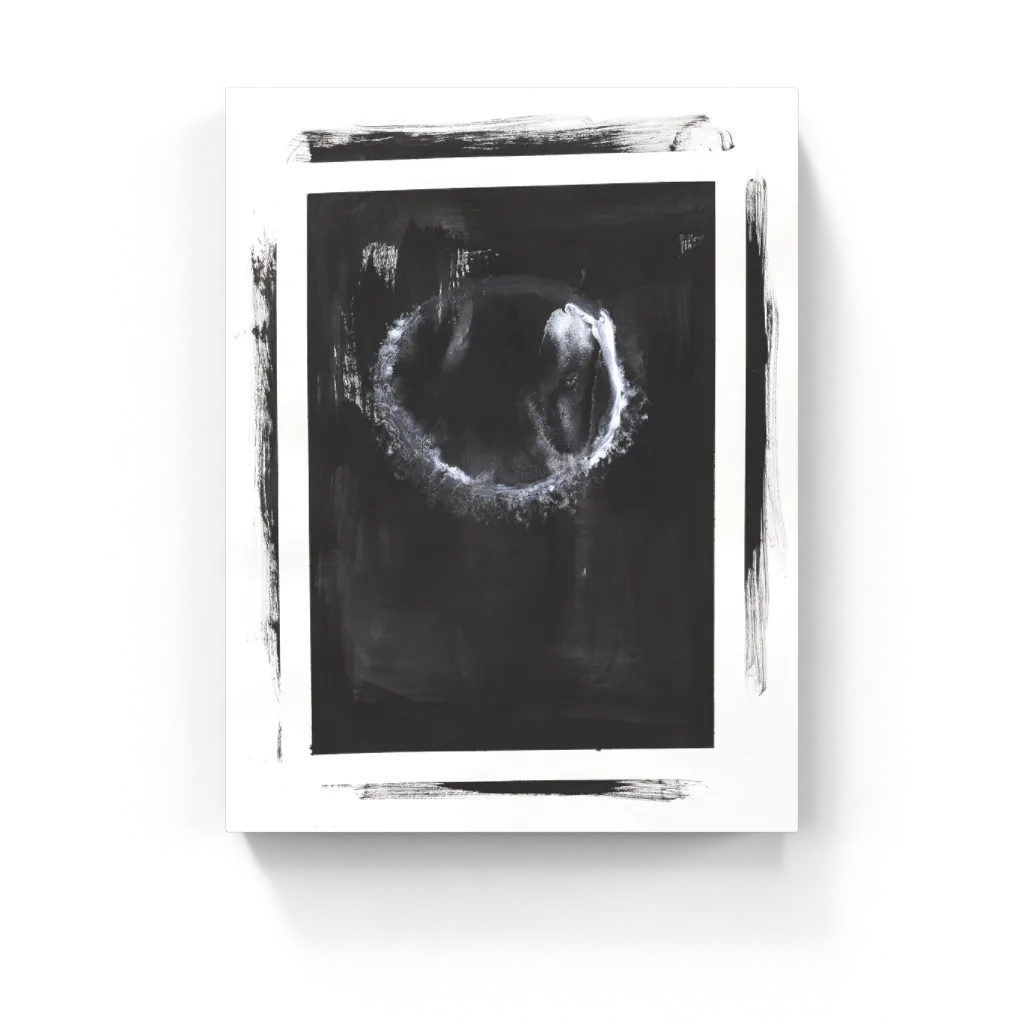 A ghostly ring of white glows against a pitch-black field, framed by gestural brush marks that blur the line between control and chaos. This monochrome abstract evokes eclipse, aura, and the edge of perception.