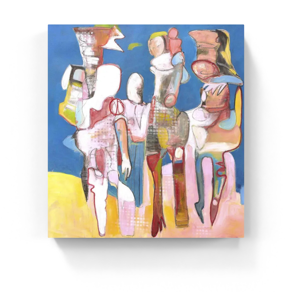 “Little More Conversation” bursts with surreal dialogue—elongated, abstract figures in a kaleidoscope of pinks, yellows, and reds gather against a bold blue sky, their gestures and silhouettes hinting at animated exchange and inner tension.