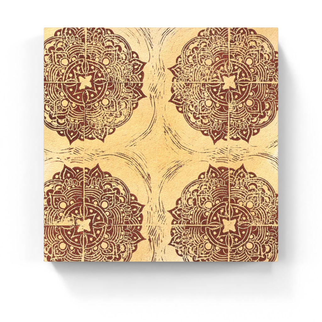 Rust-toned mandalas radiate in perfect alignment across a golden parchment ground, each centered with a bold star motif. “Mandala VI” is both cosmic and orderly—an ornamental grid of sacred symmetry.