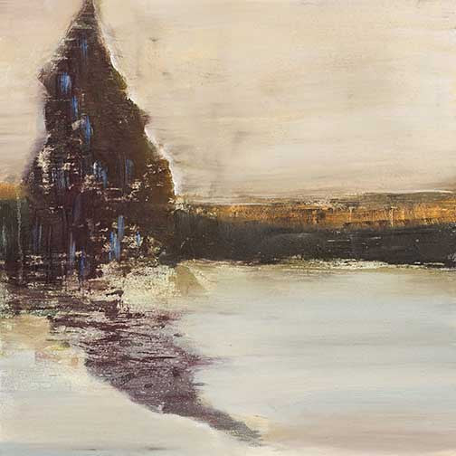 Abstract landscape painting featuring muted earth tones, soft textures, and reflective water, evoking a serene and introspective mood.