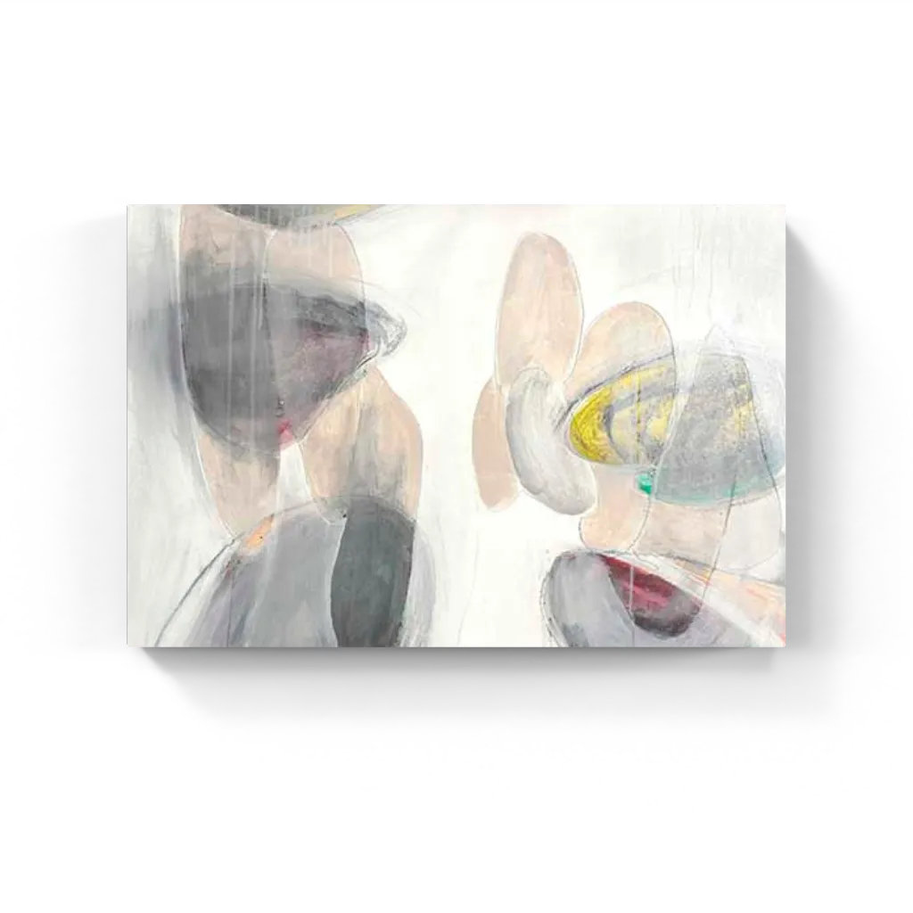 Abstract composition featuring delicate translucent forms layered softly in neutral tones with subtle pops of color, creating an airy and gentle atmosphere.