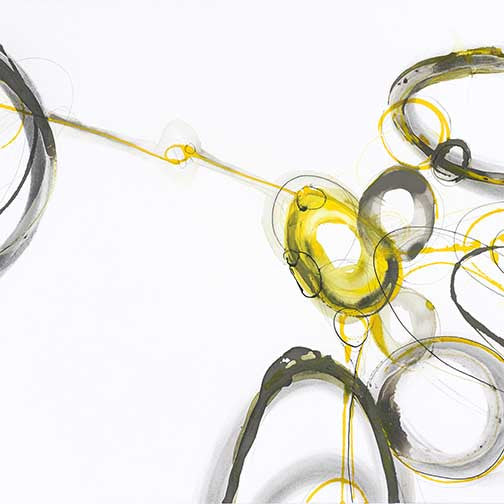 Abstract minimalist painting featuring fluid, interconnected yellow and gray circles and lines against a pristine white background, evoking organic movement and dynamic simplicity.