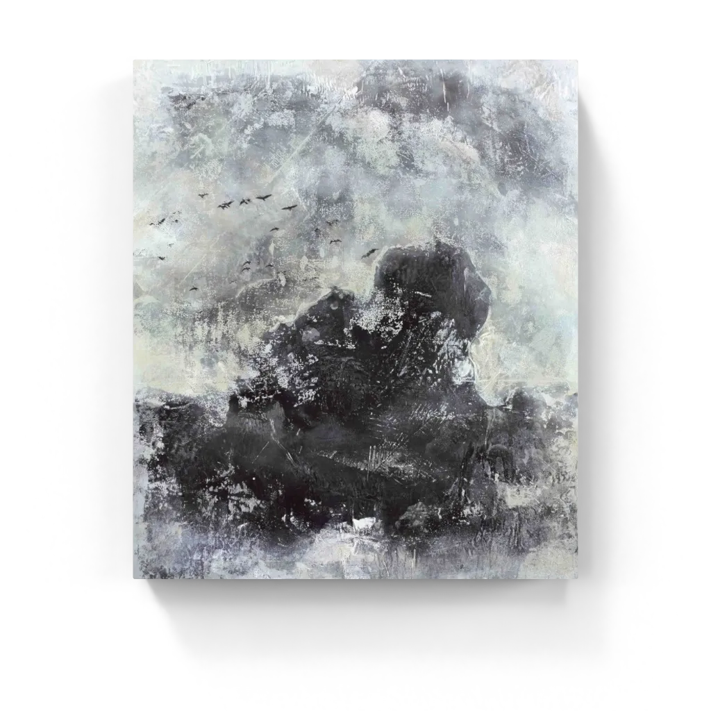 An atmospheric abstract artwork showcasing muted, misty layers of gray and pale blue textures, accentuated by a delicate flock of birds soaring gently through the haze.