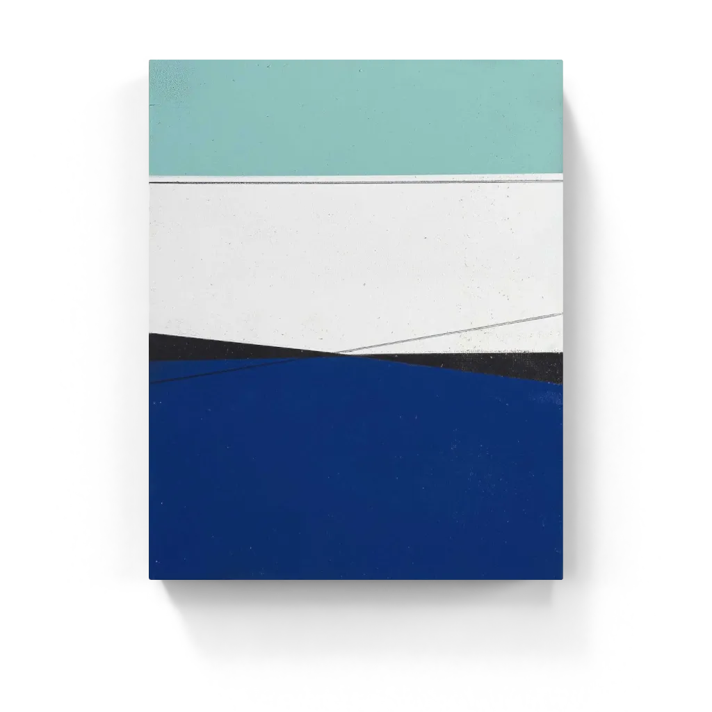 This minimalist color block abstract features crisp horizontal bands of aqua, white, black, and deep blue. The intersecting forms create a clean, modern rhythm that feels both structured and architectural. Sleek and refined, this artwork offers bold clarity and quiet sophistication, making it an ideal focal point for contemporary interiors.
