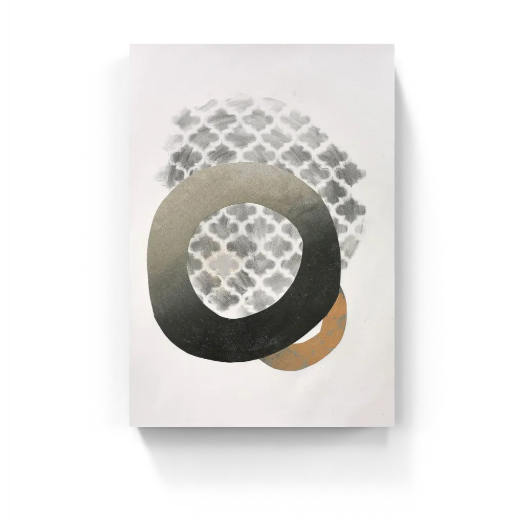 This composition reflects modern abstract art through the interplay of bold circular cutouts and an ornate grey quatrefoil backdrop. Earthy tones of black, taupe, and terracotta introduce warmth and contrast, creating a layered, textural work that balances structure with decorative rhythm.