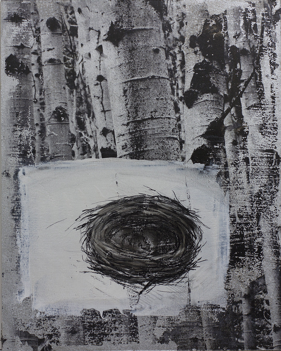 Monochromatic mixed-media artwork combining photographic textures of aspen trees with a detailed, charcoal-like nest, evoking feelings of solitude, tranquility, and introspection.