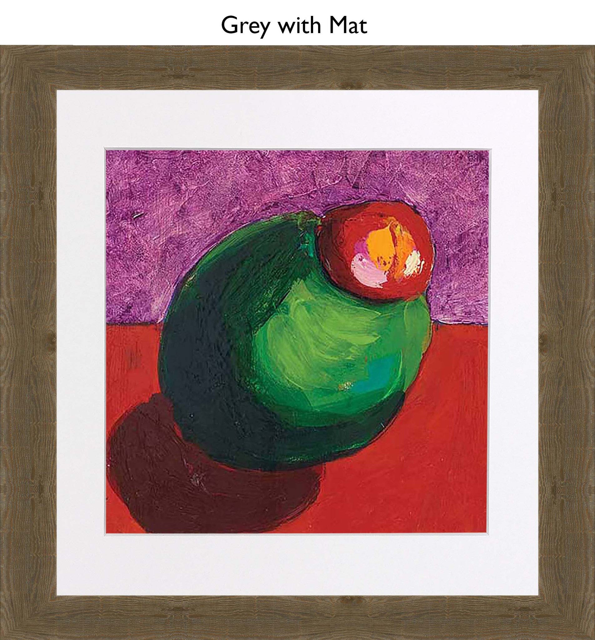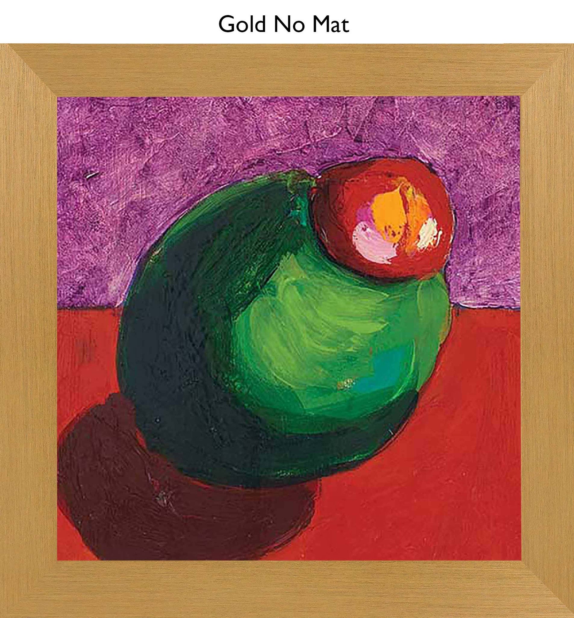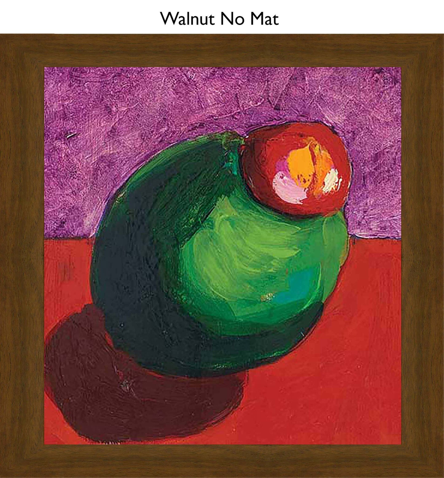 A vibrant green olive and radiant pimento pop against rich purple and crimson in this bold, modern still life. Saturated color and dynamic contrast deliver pure visual flavor.