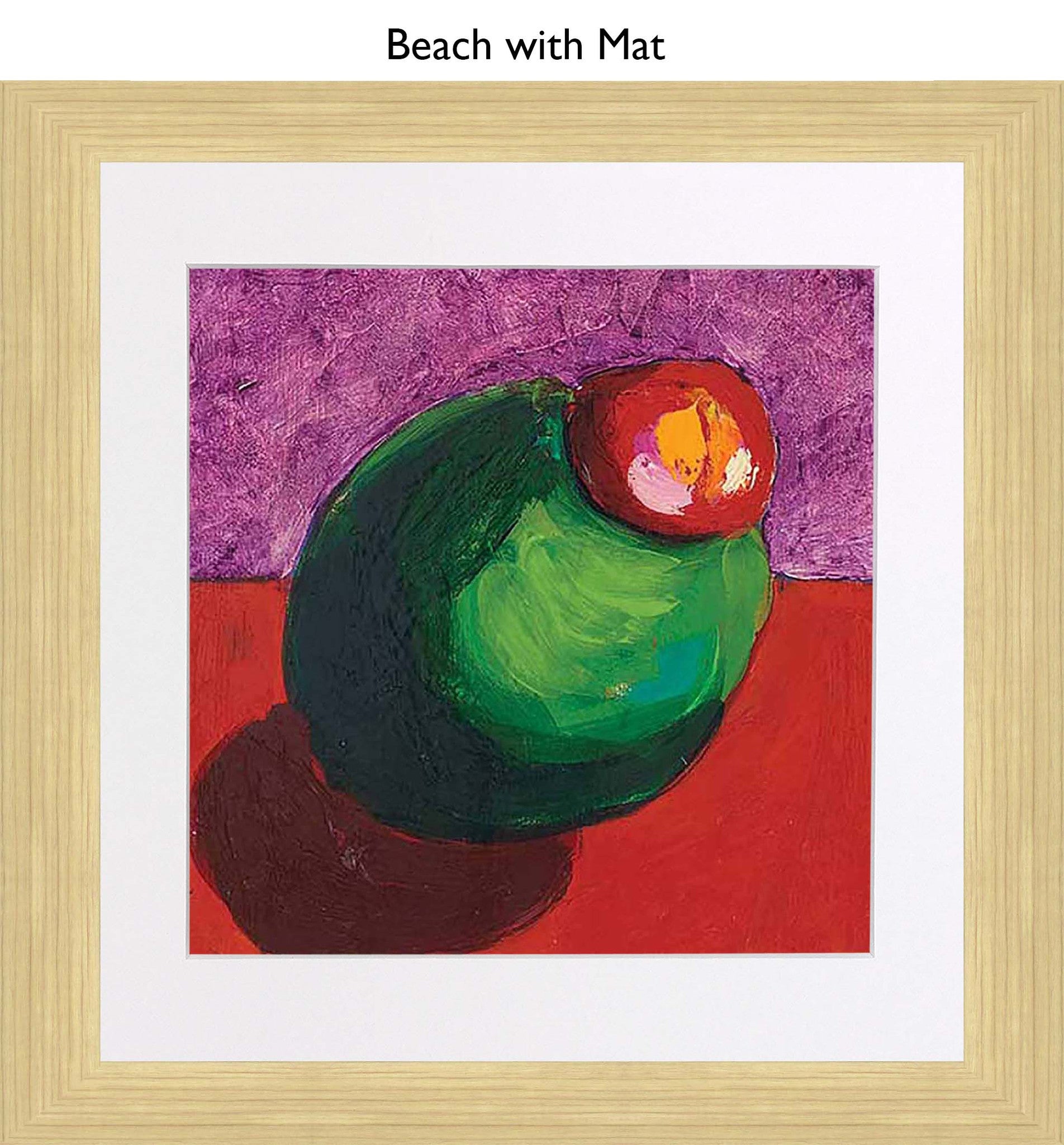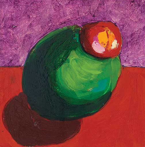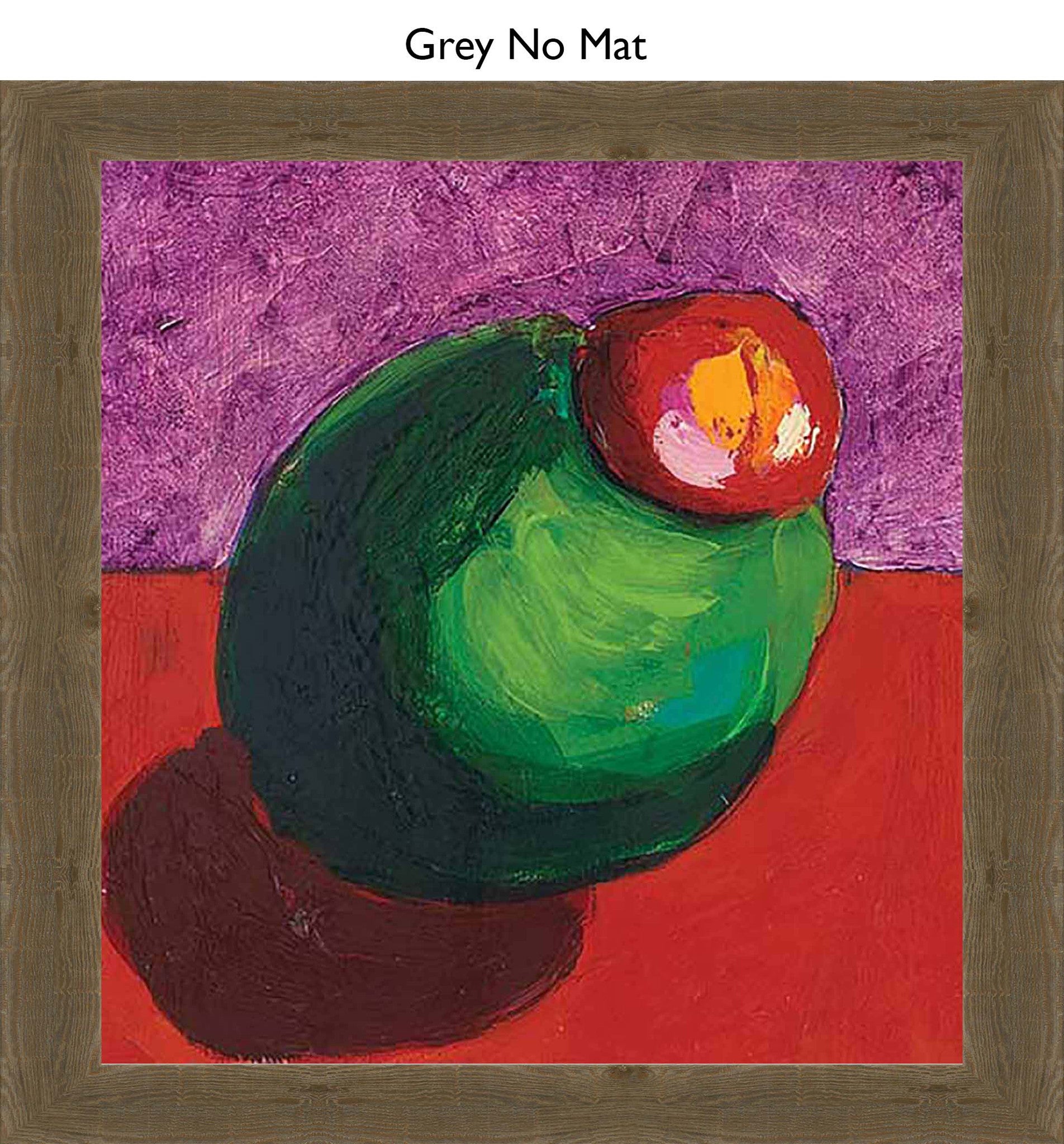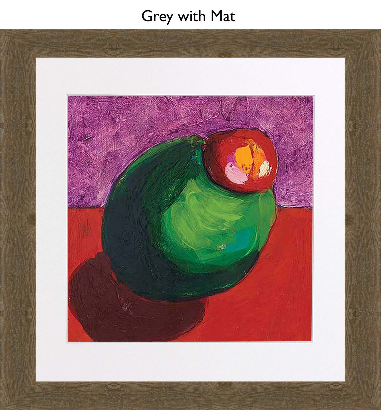 A vibrant green olive and radiant pimento pop against rich purple and crimson in this bold, modern still life. Saturated color and dynamic contrast deliver pure visual flavor.