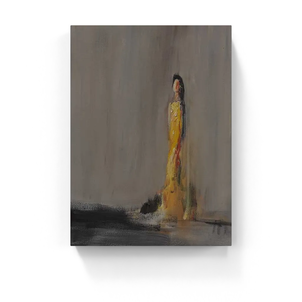 A solitary, spectral figure glows in warm tones against a vast, shadowy void. Minimal yet emotional, this moody abstract evokes presence, distance, and quiet transformation.
