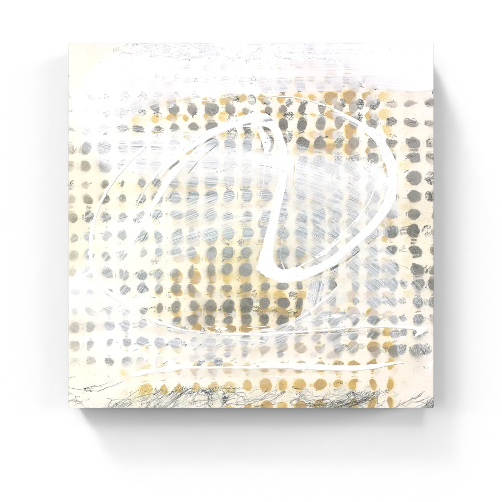 Soft yet energetic, this abstract artwork intertwines gentle white brushstrokes with delicate grids of gray and gold dots. Its airy textures and fluid lines evoke an understated, harmonious rhythm, capturing subtle contemporary elegance.