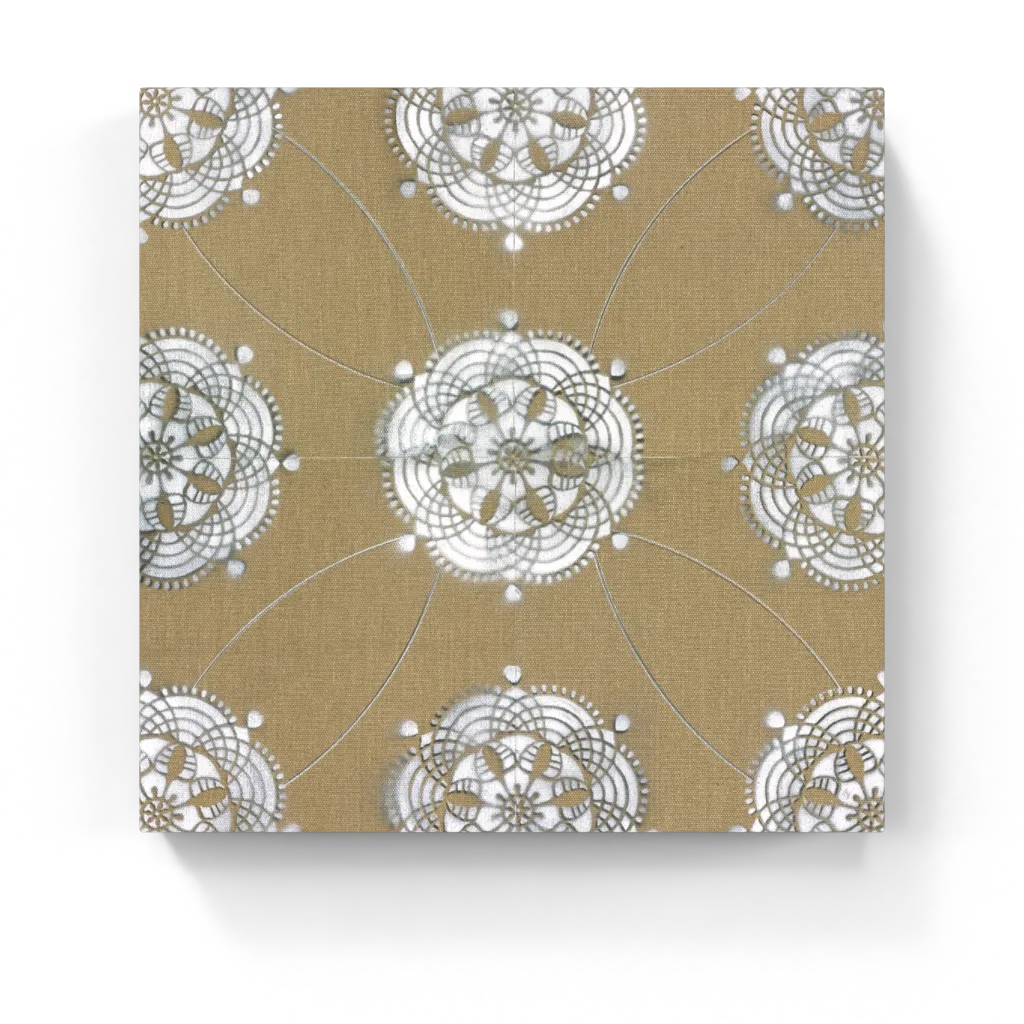 Intricate white mandalas radiate across a muted gold field, their lace-like symmetry connected by fine, orbit-like lines. “Phobos I” merges geometry and textile softness in a pattern that feels both ancient and futuristic.