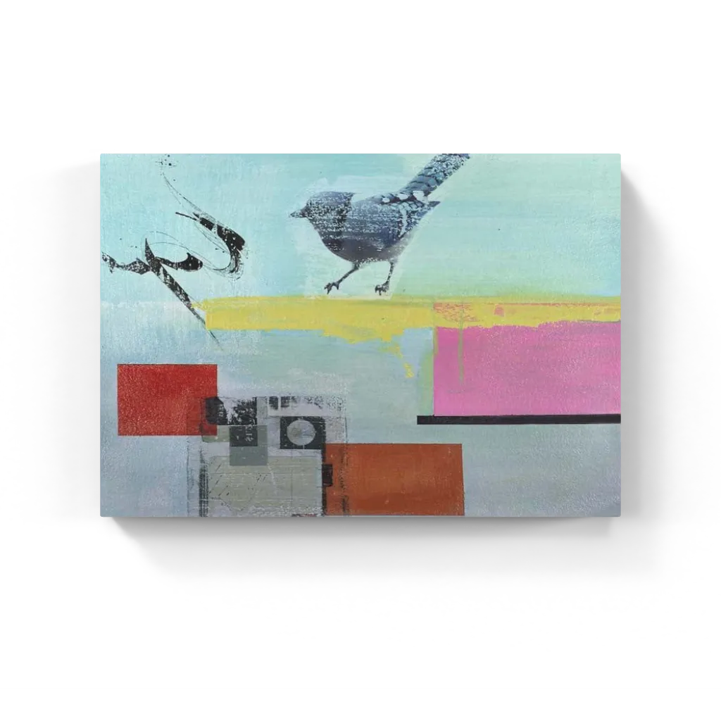 A single bird steps through a pastel dreamscape of yellow, pink, and teal. Surrounded by bold geometric blocks and energetic black marks. This abstract bird artwork carries a playful pop art spirit, blending color, motion, and personality in one vibrant composition. Perfect for contemporary interiors seeking charm and creative energy.