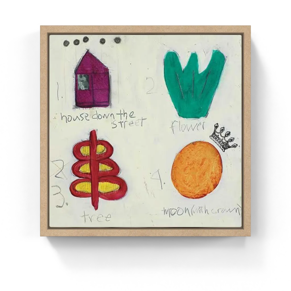 Playful and symbolic, four bold forms—a house, flower, tree, and crowned moon, sketched with childlike wonder. And labeled in loose, handwritten charm. This playful symbolic sketch feels like a visual poem, blending innocence with personal myth. Whimsical, warm, and expressive, perfect to bring a touch of narrative magic to any modern interior.